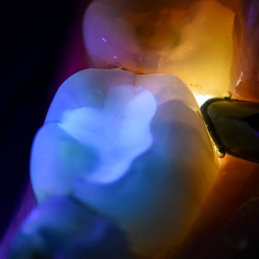 Modern dental composites and adhesives contain fluorophores which help in producing better aesthetic results. This gives them a fluorescent property.