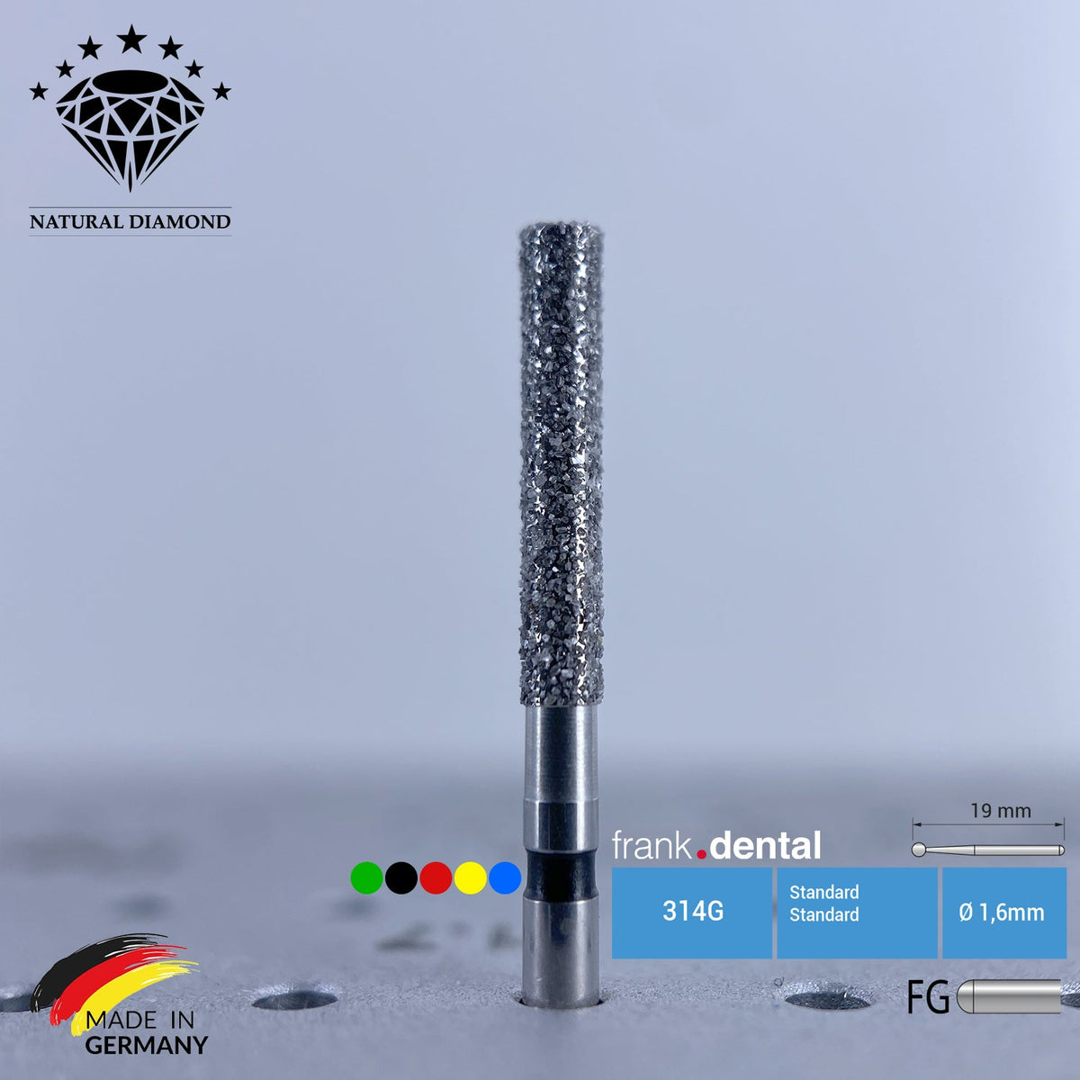 Diamond dental burs: Diamond is the hardest natural material known to man and, therefore, is the material of choice when it comes to wearing down the hardest tissue in the human body: tooth enamel. Diamond burs have a steel shank and an active part coated with natural or synthetic diamond powder. The vast majority of commercially available dental burs are made of synthetic diamond and it is less common to come across natural diamond burs. Manufacturers who use natural diamond usually emphasise this characteristic, as it gives the burs greater quality, efficiency and durability. Of course, the cost of a natural diamond burr is higher than that of a synthetic diamond burr.