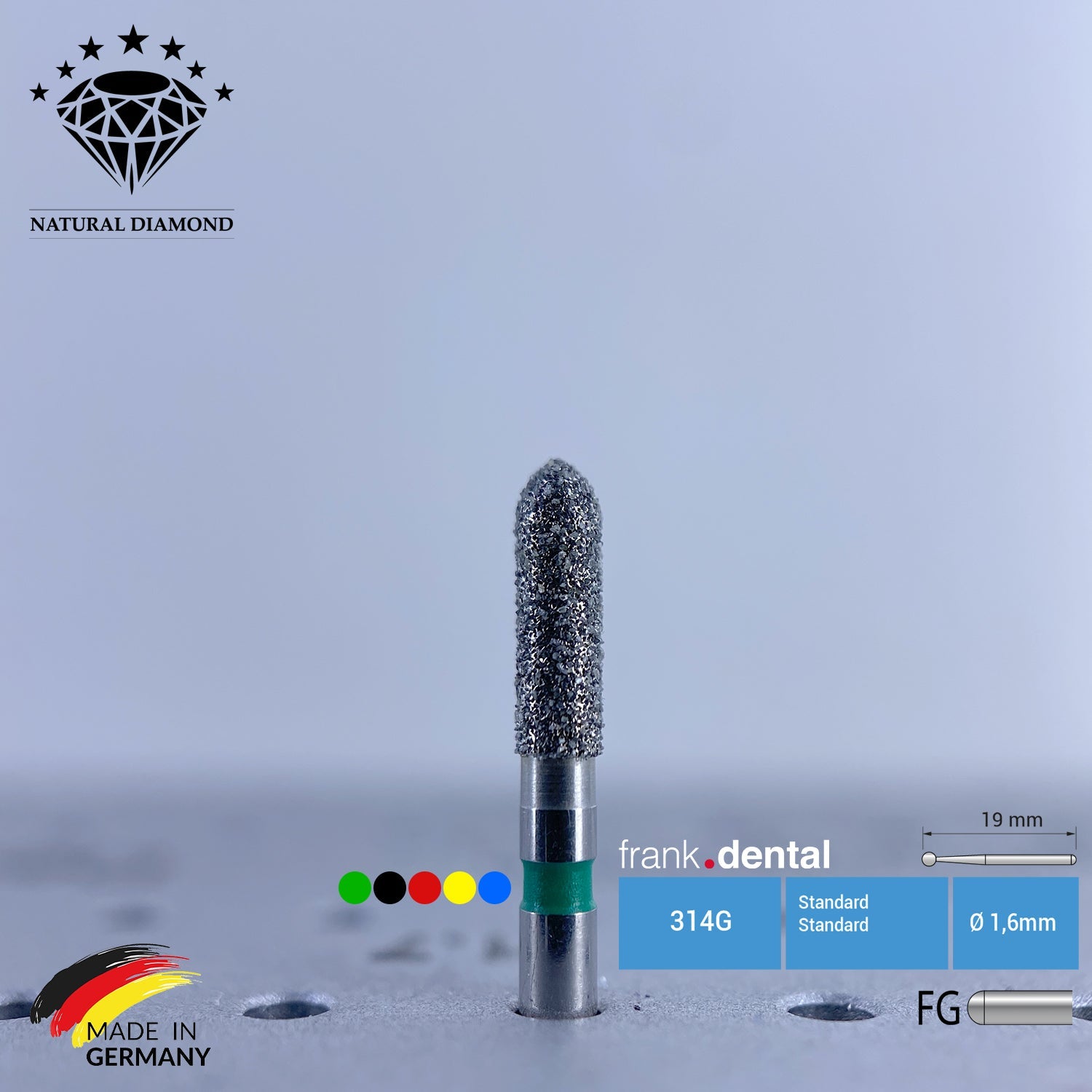 Diamond dental burs: Diamond is the hardest natural material known to man and, therefore, is the material of choice when it comes to wearing down the hardest tissue in the human body: tooth enamel. Diamond burs have a steel shank and an active part coated with natural or synthetic diamond powder. The vast majority of commercially available dental burs are made of synthetic diamond and it is less common to come across natural diamond burs. Manufacturers who use natural diamond usually emphasise this characteristic, as it gives the burs greater quality, efficiency and durability. Of course, the cost of a natural diamond burr is higher than that of a synthetic diamond burr.