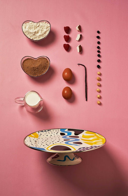Flashback cake stand is a funky twist to classic plates with its colorful design inspired by memphis and disco trends. It is as delicious as the cake on it.