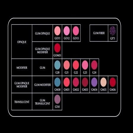Advantages: Composite with excellent mechanical and physical properties and microfillers Color concept matching natural gum color Aesthetic appearance resembling natural gums Unlimited variety of gum production Easy polishing and gloss