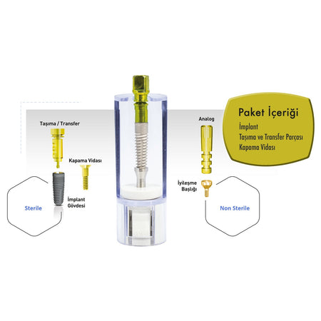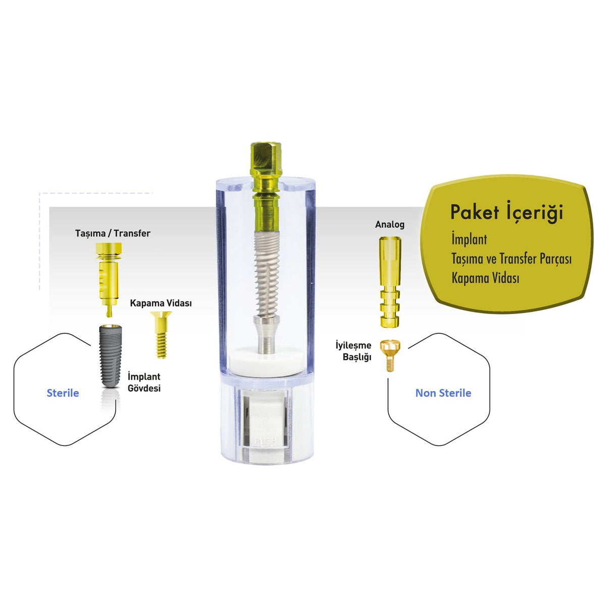 Omnicon Implants are manufactured by chip manufacturing method on state-of-the-art "Computerized Numerical Controlled" machines. In order for the implant to be ideally placed in the smaller diameter hole drilled into the bone and to be placed in a larger area in the soft bone, two Two-Entry Buttress-type grooves have been drilled on the body and two mutually cutting shaping channels have been cut on the body where these grooves can make their own way.