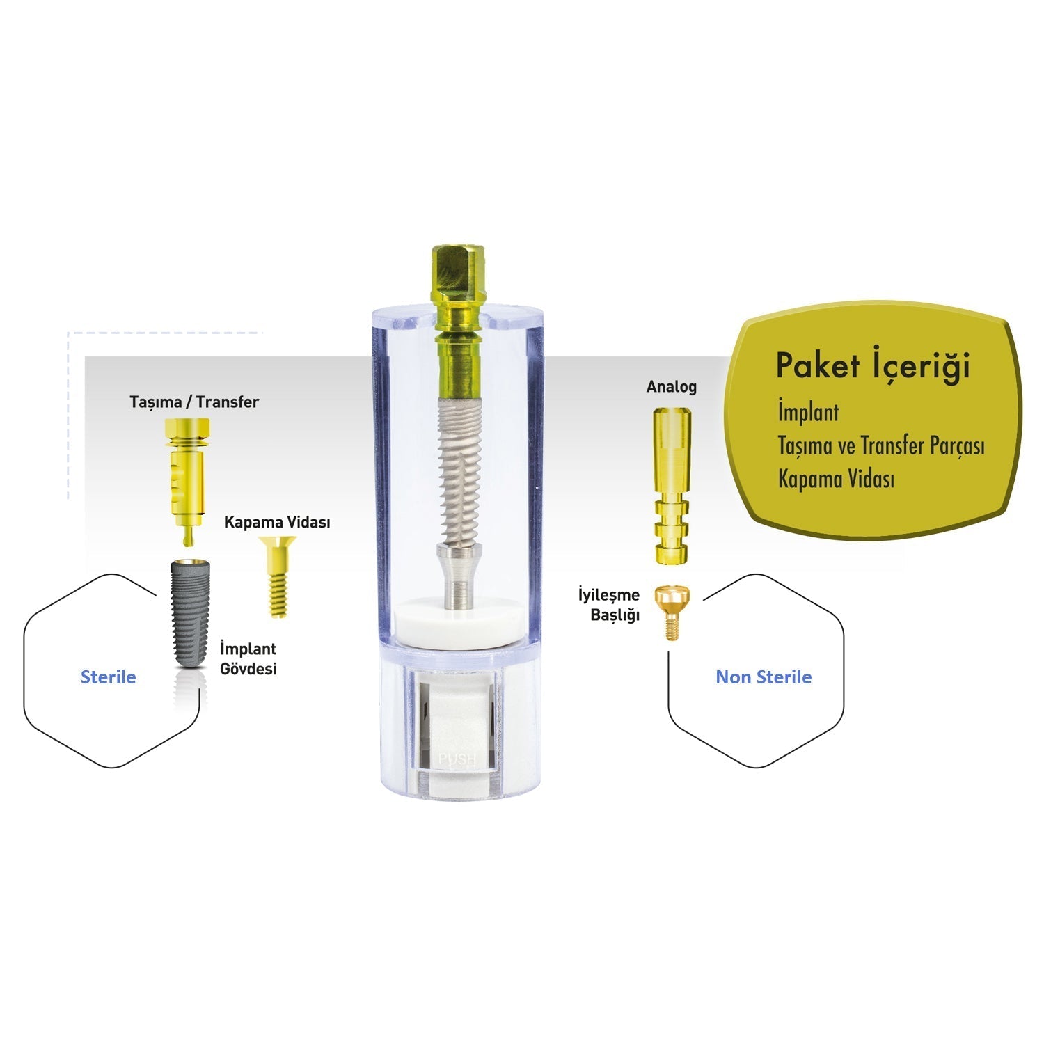 Omnicon Implants are manufactured by chip manufacturing method on state-of-the-art "Computerized Numerical Controlled" machines. In order for the implant to be ideally placed in the smaller diameter hole drilled into the bone and to be placed in a larger area in the soft bone, two Two-Entry Buttress-type grooves have been drilled on the body and two mutually cutting shaping channels have been cut on the body where these grooves can make their own way.