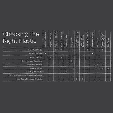 Essix Brand Plastics give you the quality you demand and the versatility you need. Essix A+ Plastic is thermoformed to fabricate intra-oral appliances such as bite planes, splints, and snoring appliances. Bite planes may be used to treat patients with a deep bite. Removable bite plane appliances can easily be fabricated in-office with Essix A+ Plastic. Essix A+ Plastic is suitable for use with non-bruxers. .