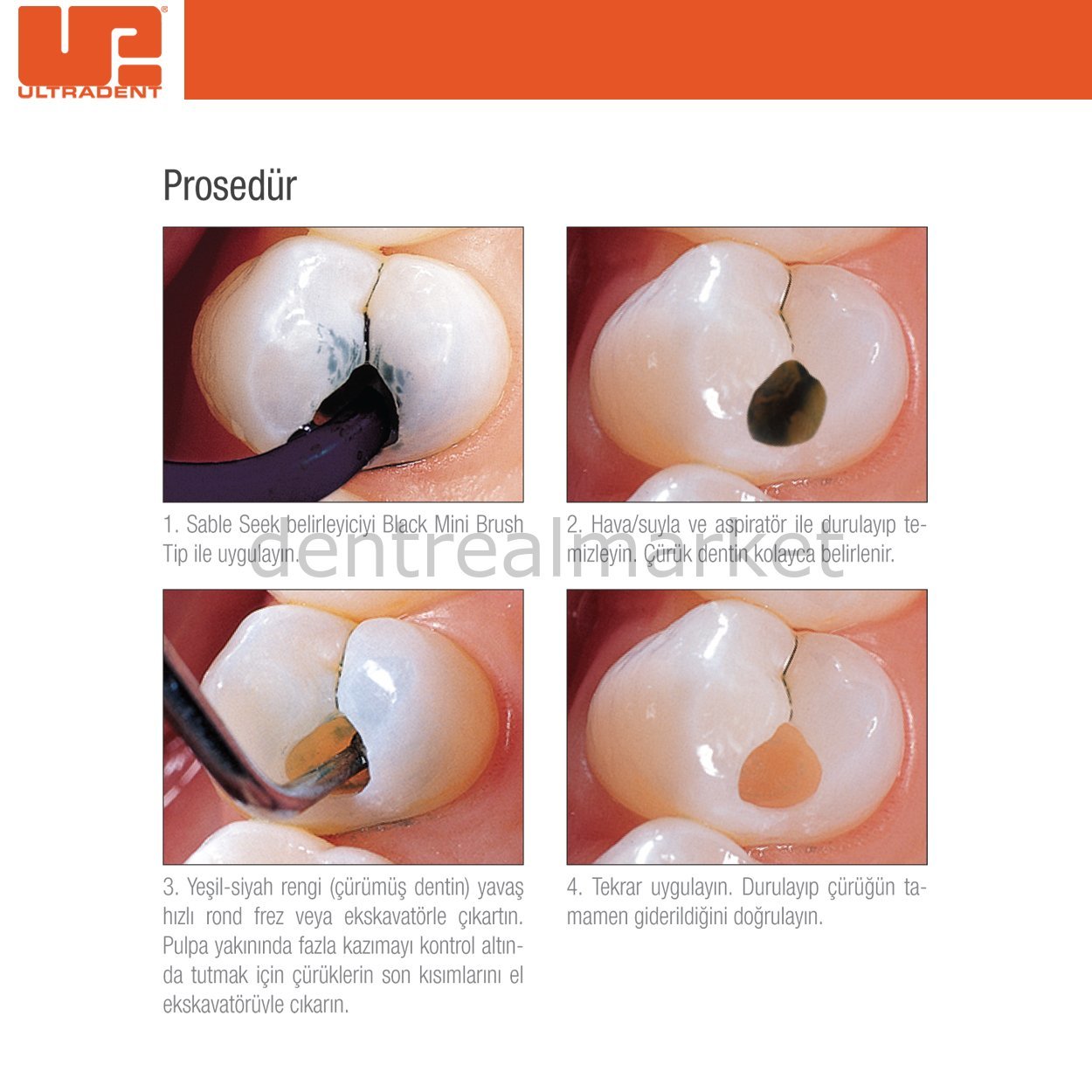 Seek and Sable Seek caries markers are very useful for hard-to-see areas by staining demineralized dentin, for example; undercut parts of preparations, dark dentin, areas in enamel dentin composition, etc. Both the Seek and Sable Seek caries markers allow the rapid and effective identification of calcified root canal entrances.1–3 The Green Sable Seek caries marker provides visualization of caries in deep caries to help avoid pulp exposure.